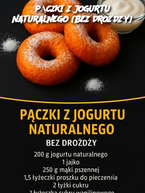 🍩🥯 PĄCZKI Z JOGURTU NATURALNEGO (BEZ DROŻDŻY) 🥯🍩 📝 Składniki (na ok. 15 małych pączków): 200 g jogurtu naturalnego 1 jajko 250 g mąki pszennej 1,5 łyżeczki proszku do pieczenia 2 łyżki cukru 1 łyżeczka cukru wanilinowego (lub skórka z cytryny) szczypta soli olej do smażenia cukier puder do oprószenia Przepis jest kontynuowany na następnej stronie