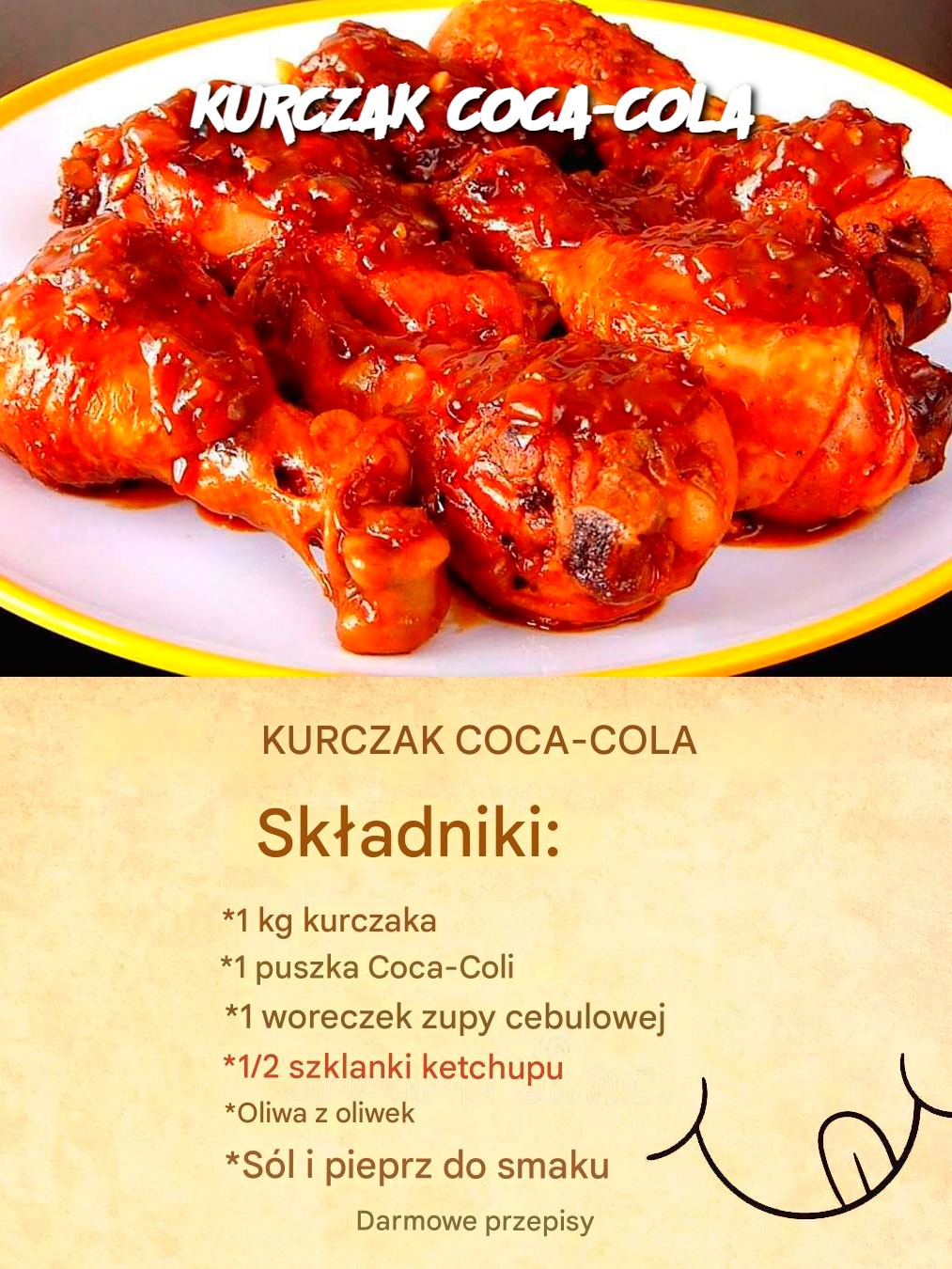Składniki: 1 kg kurczaka (mogą to być uda, pałki lub piersi) 1 puszka Coca-Coli (330 ml) 1 opakowanie zupy cebulowej (40 g) 1/2 szklanki ketchupu Oliwa z oliwek Sól i pieprz do smaku Przygotowanie: Kurczaka oczyścić i osuszyć papierowym ręcznikiem. Dopraw kurczaka solą i pieprzem do smaku. Przepis jest kontynuowany na następnej stronie