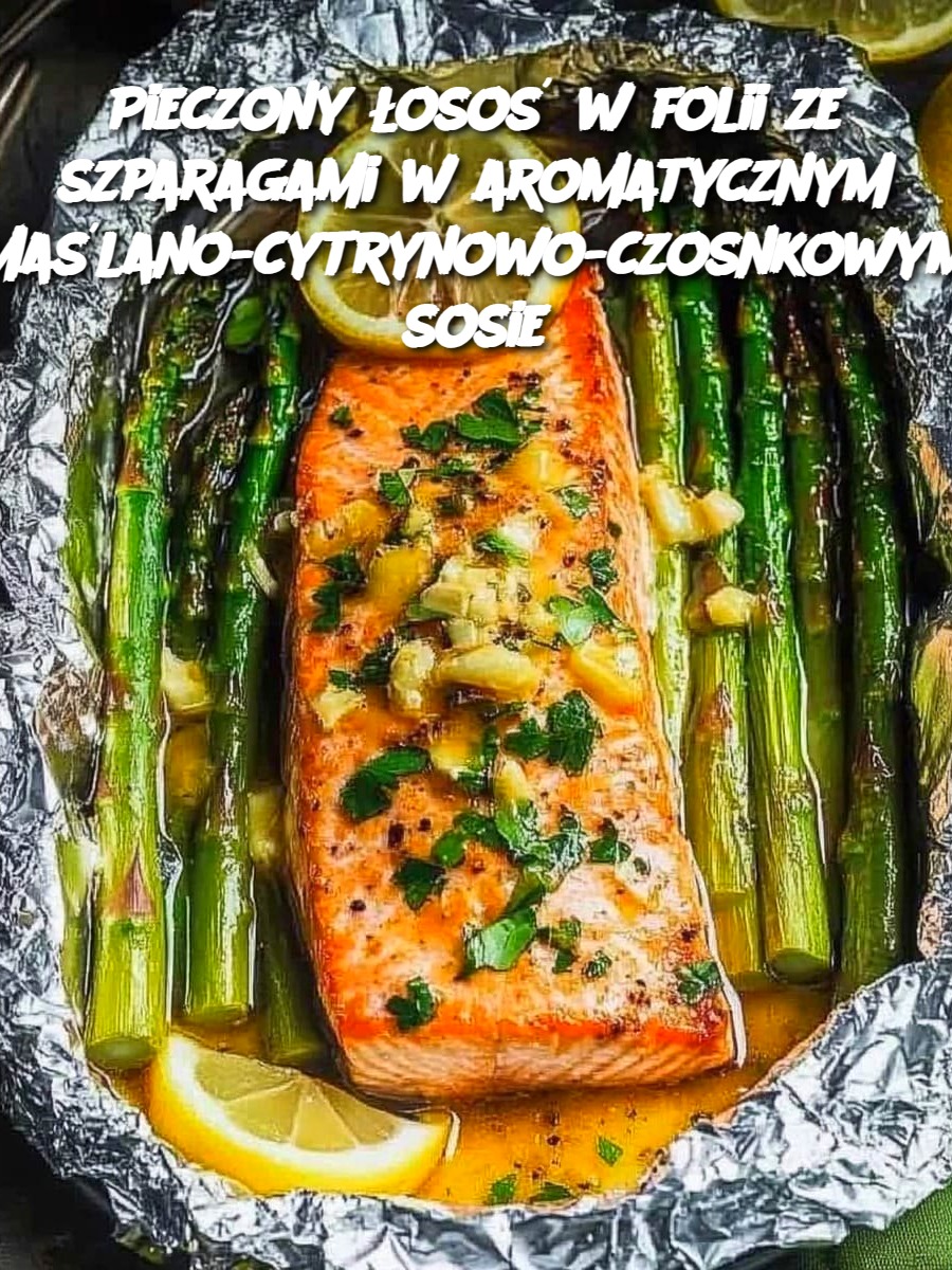 Pieczony łosoś w folii ze szparagami w aromatycznym maślano-cytrynowo-czosnkowym sosie